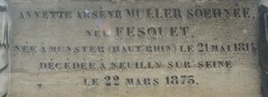 Annette Arsène MULLER SÖEHNÉE Née FESQUET, Née à Munster (Haut-Rhin) le 21 Mai 1814 Décédée à Neuilly sur Seine le 22 Mars 1875 | |