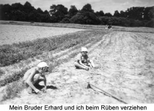 Ich kann mich auch noch daran erinnern, daß in der Erntezeit lange Tische und Bänke aus Brettern für die Erntehelfer aufgestellt wurden, wo diese verköstigt wurden. Diese Erntehelfer waren Flüchtlinge, die in der sog. Barackenstraße in Holzbaracken wohnten und gegen Naturalien (Kartoffeln oder Getreide) bei der weitgehend noch manuellen Ernte mithalfen.