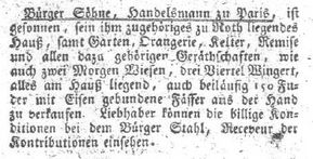 Das Schlössel in Rhodt ist möglicherweise 1803 verkauft worden. Dafür spricht ein Inserat im Landauer Frage- und Anzeigeblatt im 11. Jahr der Republik, S. 168. Danach war im Messidor 11 (ca. Juli 1803) der Bürger Söhne, Handelsmann zu Paris, gesonnen, sein ihm zugehöriges zu Rhodt liegendes Haus samt Garten, Orangerie, Celier, Remise und allen dazugehörigen Gerätschaften wie auch zwei Morgen Wiesen, drei Viertel Wingert und 150 Fuder mit Eisen gebunden Fässer zu verkaufen